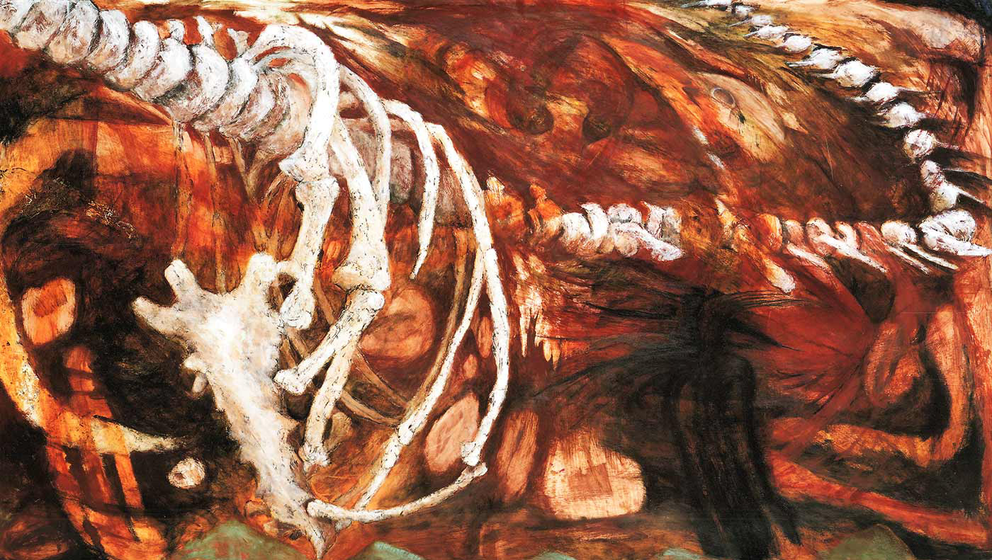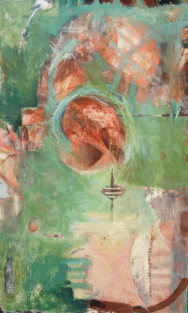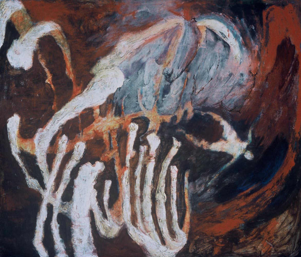 Upon completion of the Manifest Destiny series I walked alone through the canyon lands of Utah in purposeful search of the hope I had come to recognize in the horns of the buffalo skull. For one month I lived in this cave. I was surrounded and mesmerized by spirit and solitude. Since childhood having felt separate from nature, I attempted through meditation and intense awareness of Earth, to bring from my mind into my heart the indigenous peoples' belief in the interdependence of all life. Unencumbered by civilization, the starkness of the landscape and the huge expanse of uninterrupted sky seen from my home in the cave thrust me into a reliance on everything around me and an initiation into imagery that spoke loudly of that interdependence yet had no defined, nameable forms.