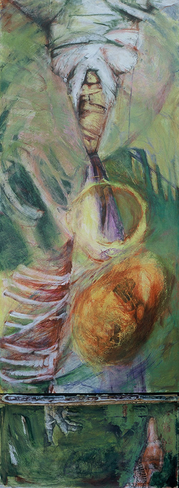 Crossing Back Over, 1995, acrylic, ink, charcoal, bee balm on paper, 60" x 24"